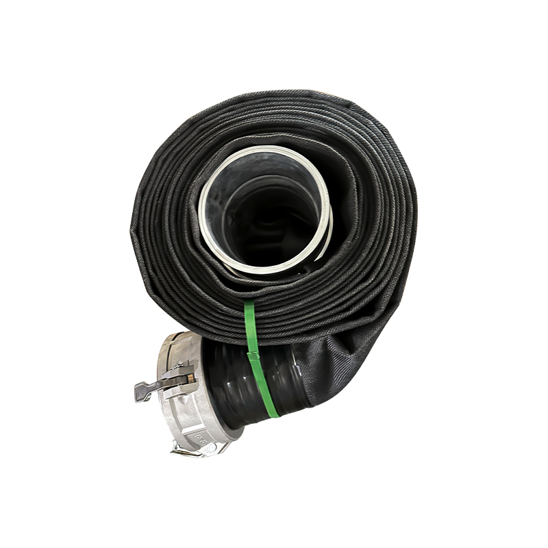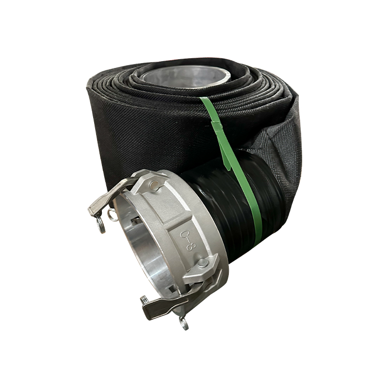 8-tums mining flat slang med Storz kopplingar, kraftig platt slang för högtrycksdränering i gruvdrift. Har snabbkopplingar från Storz och kompakt förvaring.